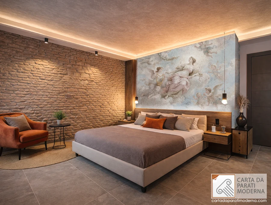 Per valorizzare al massimo il “Trionfo di Flora”, gli abbinamenti migliori prevedono letti imbottiti o testate capitonné in tessuti chiari o cipria, che riprendono i colori dominanti della composizione. Le lampade in ottone o bronzo dorato richiamano l’arpa dorata della figura musicante. I tessuti naturali chiari — lino, cotone, seta — completano l’atmosfera senza sovrastare. Una boiserie nella parte bassa della parete aggiunge raffinatezza e definisce con precisione la zona della testata. Evita colori troppo saturi o mobili dall’estetica molto industriale: il contrasto sarebbe stridente rispetto alla grazia della scena celeste.