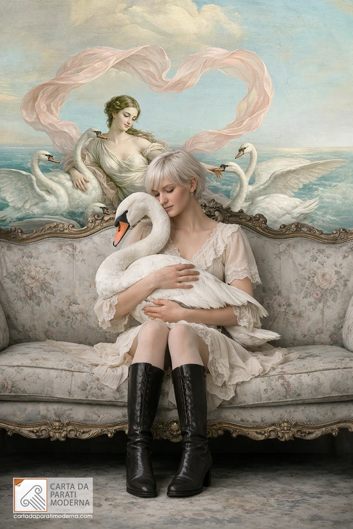Questa composizione non è una stampa generica: è un’opera originale concepita fin dall’inizio come affresco digitale su carta da parati, progettata per sfruttare la superficie murale come terza dimensione narrativa. Ogni elemento — la luce radente sull’acqua, la seta rosata che disegna un cuore nell’aria, la dea che si abbandona al portato dei cigni — è calibrato per creare un’illusione di profondità che inganna l’occhio e amplifica il volume percepito dell’ambiente.