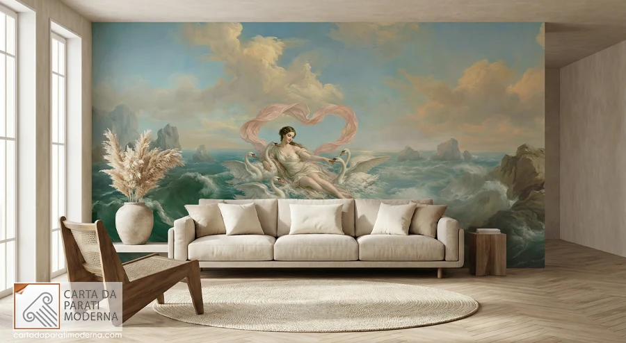 Venere tra i Cigni porta con sé due millenni di iconografia mitologica, la tecnica della grande pittura europea e la precisione della stampa digitale di nuova generazione. È simultaneamente antica e contemporanea, familiare e sorprendente, decorativa e filosofica. È esattamente ciò che una decorazione murale di arredamento di lusso dovrebbe essere: un’opera che si guadagna il proprio posto non perché riempie uno spazio, ma perché lo trasforma irrimediabilmente.