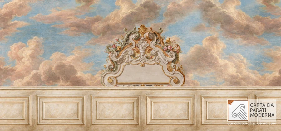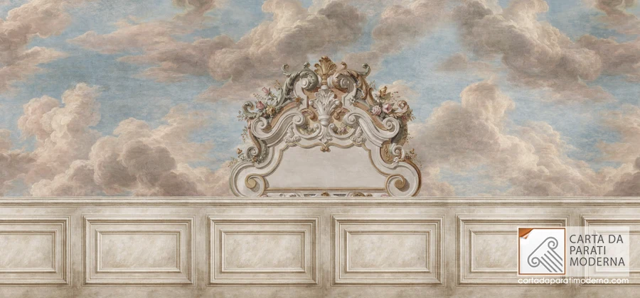 Una carta da parati classica di questo livello non è semplicemente un rivestimento murale: è un intervento architettonico. Modifica la percezione delle proporzioni della stanza, altera la qualità della luce riflessa, introduce una narrazione visiva che evolve con il variare dell’illuminazione. Di mattina, con la luce naturale che filtra, le nuvole dipinte sembrano rischiararsi. Di sera, con le lampade accese, gli stucchi dorati catturano i riflessi caldi e la scena si arricchisce di teatralità.