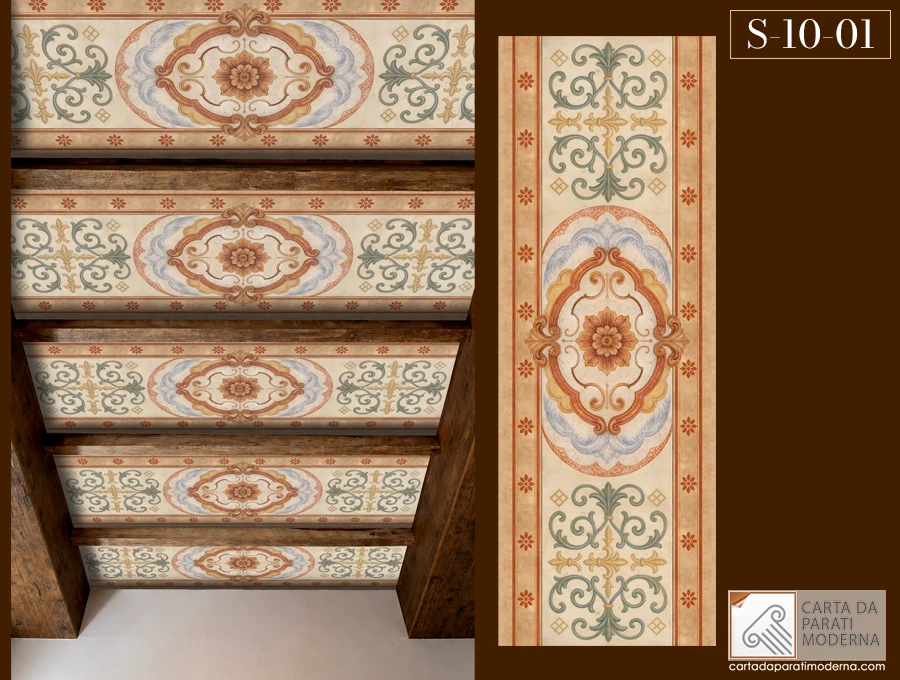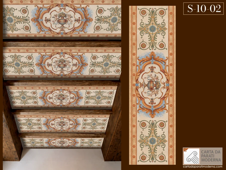 L’immagine che osserviamo rivela un capolavoro di equilibrio architettonico: un soffitto dove massicce travi in legno a vista scandiscono lo spazio, incorniciando eleganti decorazioni che ricordano gli antichi affreschi rinascimentali. Ogni campata tra le travi ospita un motivo ornamentale complesso: al centro, un medaglione ovale con fiori stilizzati nei toni del terracotta e dell’ocra, circondato da volute barocche in verde salvia e oro pallido, mentre una bordura superiore e inferiore presenta stelle geometriche che impreziosiscono l’intera composizione.