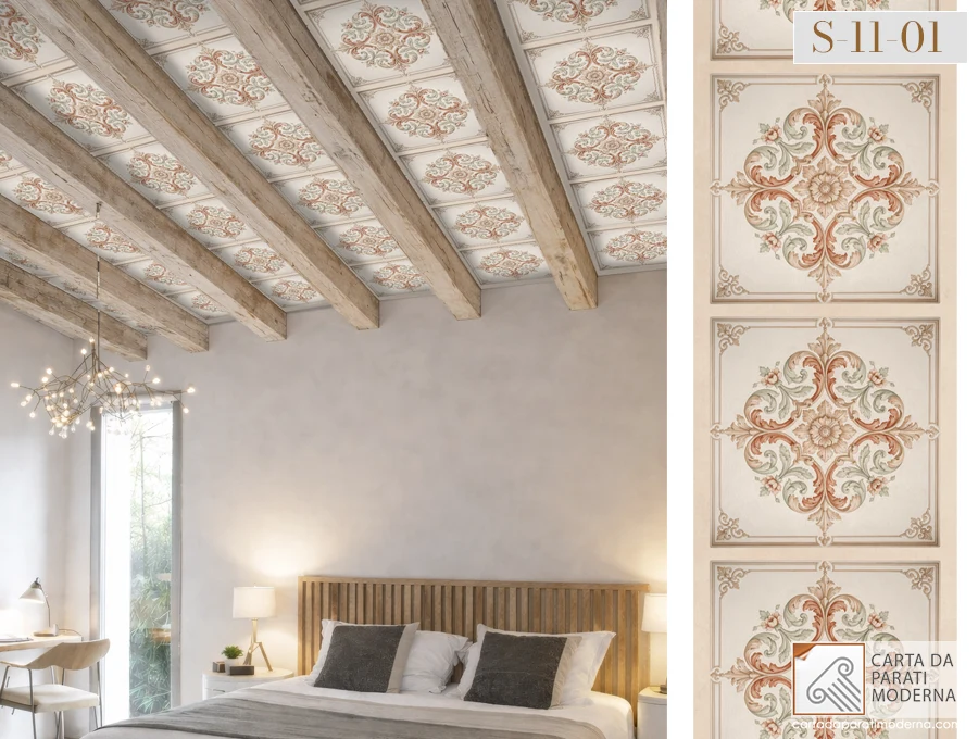Guardando l’immagine di una camera da letto con soffitto travi e carta da parati decorativa, la logica diventa immediatamente chiara: ogni spazio tra una trave e l’altra diventa un pannello autonomo, come un affresco incorniciato dal legno naturale. Il motivo decorativo — arabeschi, volute, fiori stilizzati, motivi geometrici, paesaggi frammentati — si ripete o si adatta di riquadro in riquadro, creando un effetto visivo continuo, coerente, straordinariamente elegante.