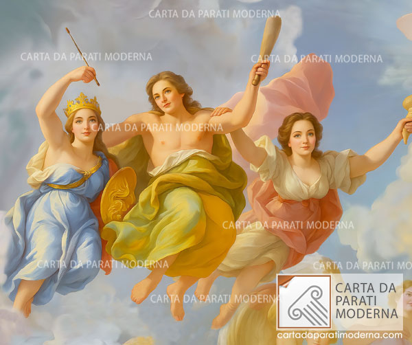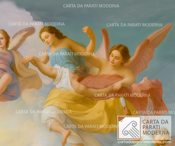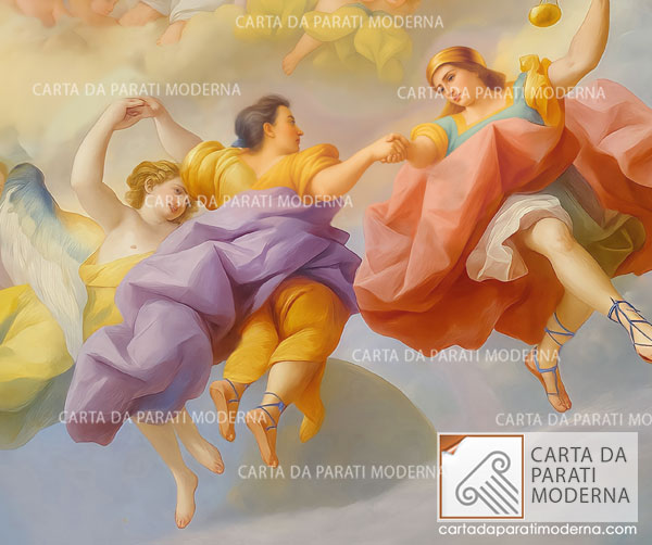 Affresco su carta da parati del 1731, raffigurante le virtù cardinali della saggezza, della giustizia, del coraggio e della temperanza con angeli danzanti e in gioco. Come tutti i nostri modelli anche questo può essere adattato alle misure della tua parete o del tuo soffitto, tutti gli elementi possono essere spostati o ridimensionati in modo da adattare la composizione di figure rappresentate alla superficie e alle proporzioni della superficie dove la stampa deve essere applicata.