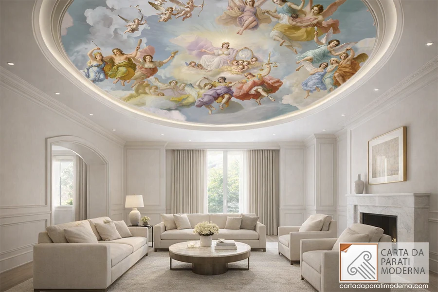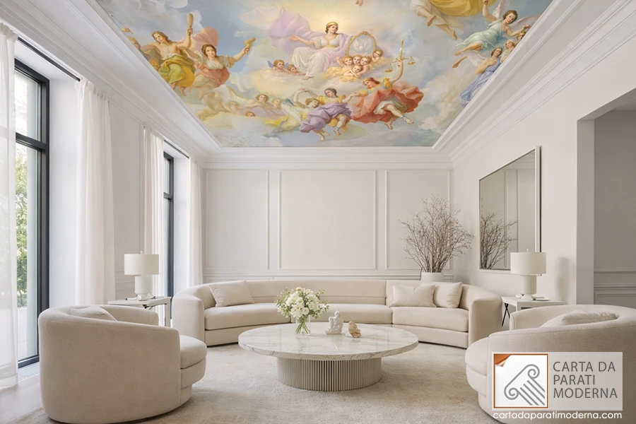 affresco su carta da parati a soffitto ambientazione in un salotto moderno elegante