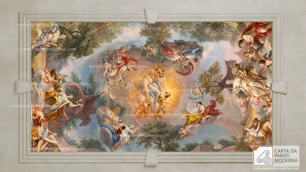 Questa carta da parati a soffitto con affresco digitale classico si ispira alla grande tradizione pittorica rinascimentale e barocca, trasformando il soffitto in un elemento decorativo di forte impatto visivo. La composizione scenografica, popolata da figure allegoriche e putti sospesi tra nuvole luminose, crea una straordinaria sensazione di profondità e apertura dello spazio. Il disegno circolare e la sapiente gestione della luce guidano lo sguardo verso il centro dell’affresco, valorizzando l’architettura dell’ambiente e conferendo eleganza, armonia e prestigio agli interni.