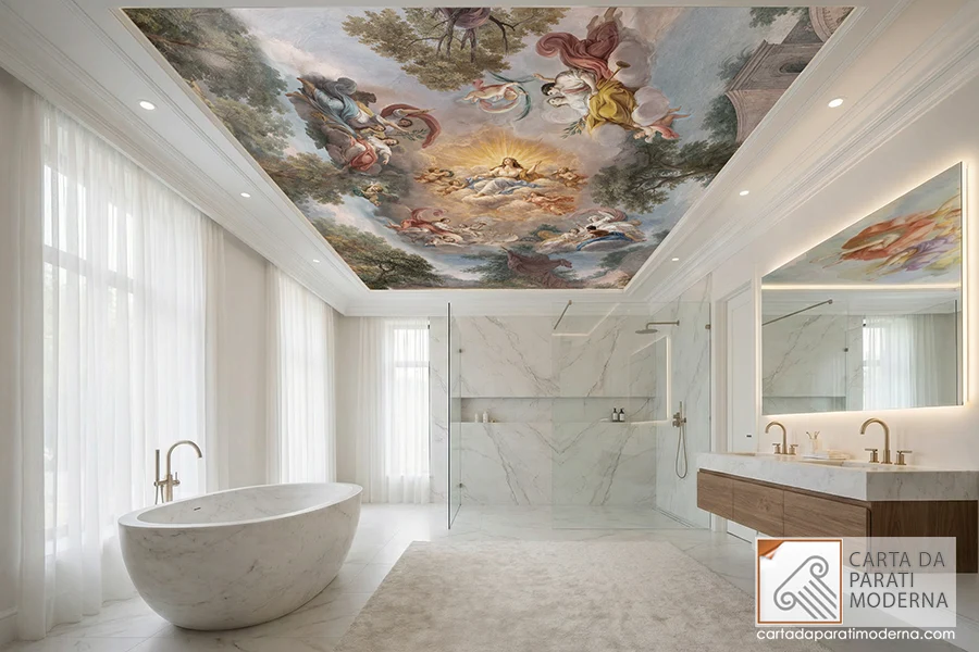 È una scelta ideale per chi cerca una carta da parati di lusso capace di unire tradizione artistica e gusto moderno, trasformando il soffitto in un vero elemento architettonico decorativo.