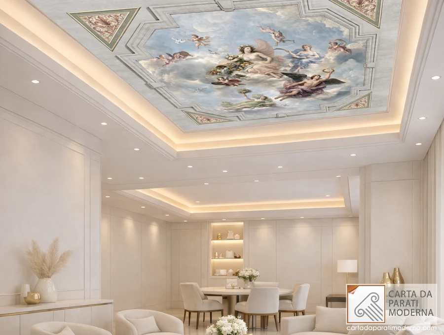 Scegli questo affresco digitale classico a soffitto per trasformare i tuoi ambienti in spazi iconici, eleganti e senza tempo, unendo arte classica, design contemporaneo e tecnologia di stampa avanzata.