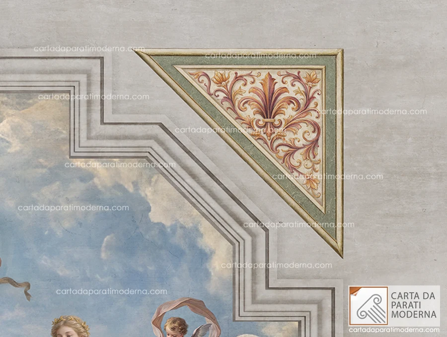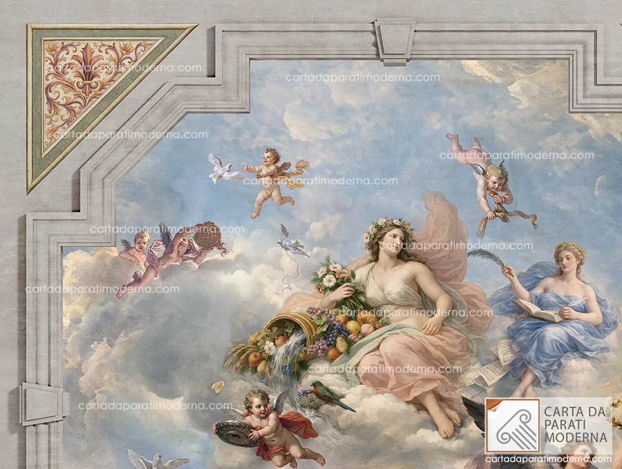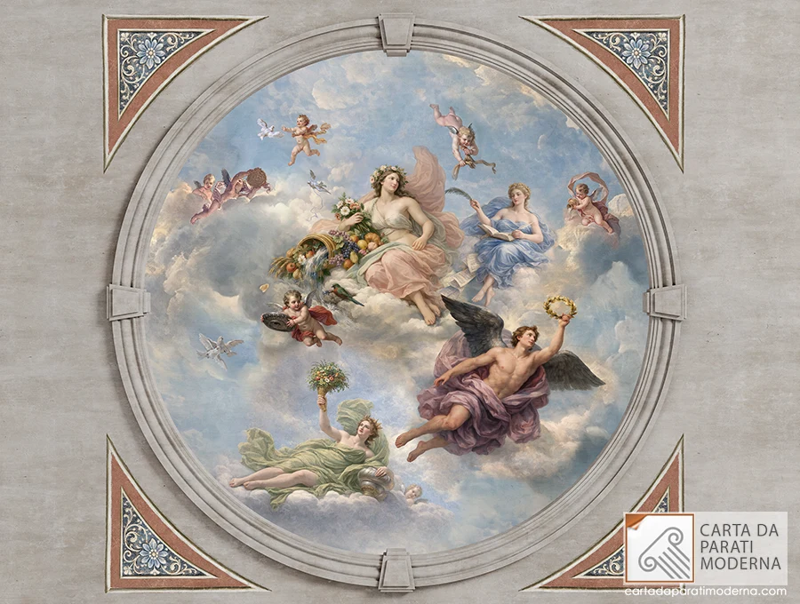 La resa pittorica, le sfumature delicate e la composizione scenografica creano un effetto affresco classico estremamente realistico, perfetto per ambienti raffinati e di rappresentanza.