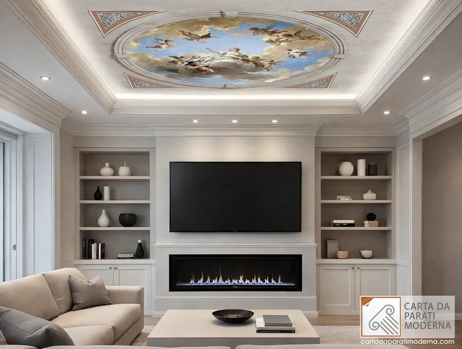 Arredamento in stile classico contemporaneo luxury, dove elementi architettonici tradizionali vengono integrati con soluzioni moderne per creare un ambiente elegante, ordinato e scenografico. Il vero elemento distintivo è il soffitto decorato con affresco in stile rinascimentale/barocco, inserito in una cornice architettonica che diventa punto focale visivo. Questo dettaglio trasforma l’ambiente in uno spazio rappresentativo, quasi scenico, evocando atmosfere storiche reinterpretate in chiave attuale.