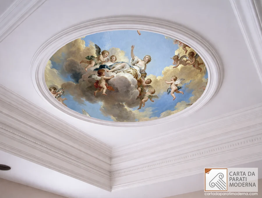 La storia della decorazione soffitto di lusso attraversa secoli di capolavori: dalla Cappella Sistina agli affreschi di Tiepolo, il soffitto dipinto ha rappresentato il culmine dell’arte decorativa. Questa carta da parati classica reinterpreta quella tradizione con gli strumenti della tecnologia contemporanea, offrendo una soluzione che unisce la maestosità degli antichi affreschi alla praticità e versatilità della stampa digitale di altissima qualità.