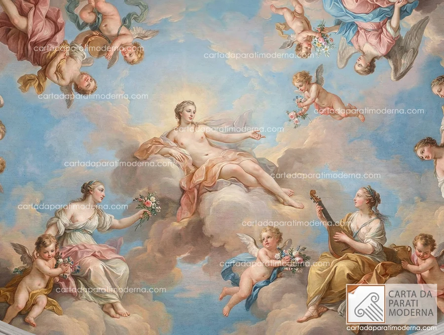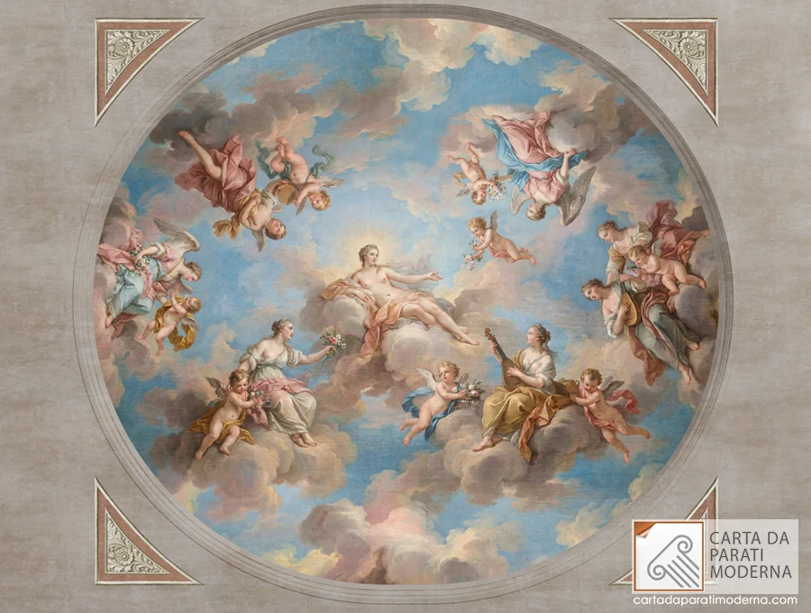 Nel panorama della decorazione d’interni di alta gamma, poche soluzioni possono competere con l’impatto scenografico di un soffitto decorato che richiama i grandi affreschi settecenteschi. Questa carta da parati effetto affresco riproduce con straordinaria fedeltà una celebrazione celeste dove Venere, circondata da figure allegoriche e putti, regna sovrana in un firmamento di nuvole dorate e azzurri luminosi. Non si tratta di una semplice decorazione: è un’architettura visiva che trasforma lo spazio sottostante in un ambiente di rara suggestione, dove lo sguardo trova riposo e meraviglia nella contemplazione di una scena sospesa tra terra e cielo.