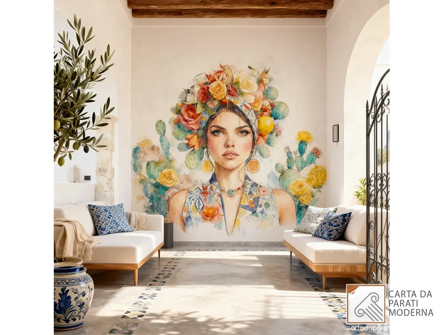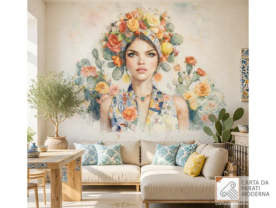 Immaginate di entrare in un salotto e trovarvi al cospetto non di una parete, ma di un giardino sospeso nel tempo. La Dea del Giardino è precisamente questo: un murale ad acquerello che trasforma ogni stanza in un luogo fuori dall’ordinario, dove una figura femminile dalla posa ieratica emerge da un intreccio di rose terracotta, cactus opunzia turchesi e maioliche blu-cobalto, portando in testa una corona di fiori e frutti degna di una sacerdotessa sicula.